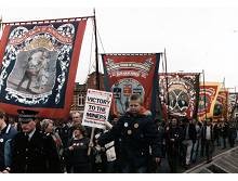 Procession of Miners Lodge banners in procession, including New Herrington, Murton, Easington.