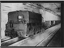 Battery locomotive shaft drift 5/4 with 10 cwt tubs. 25th October 1954. Easington Colliery.
